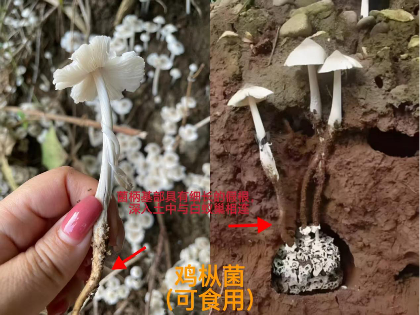 ❖鸡枞菌(可食用):菌柄基部具有细长的假根,深入土中与白蚁巢相连。