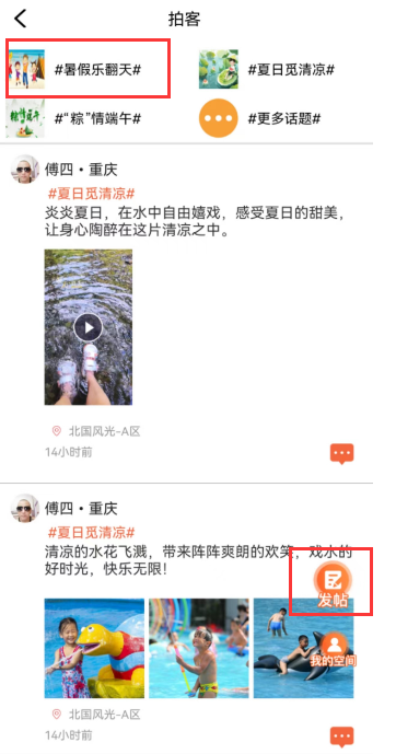 打开铜梁APP,进入拍客页面,页面上方显示了可以参与的话题活动,点击进入#暑假乐翻天#,再进行发帖即可。(PS:必须是要参与话题活动才可以参与评奖哦!)